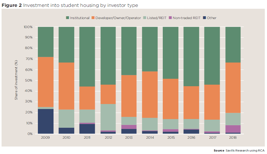 Aujourd’hui, un nombre croissant de fonds de pension, d’institutions et d’assureurs investissent activement dans le logement étudiant. Ces institutions, dont beaucoup investissent à l’échelle internationale, ont représenté environ la moitié du volume total d’investissement dans le logement étudiant entre 2011 et 2018.