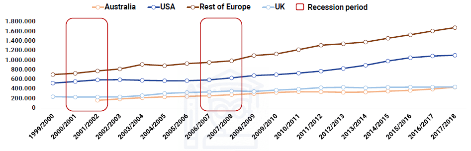 Au cours des dernières années, le marché du logement étudiant s’est mondialisé. Alors qu’il était historiquement dominé par le Royaume-Uni et les États-Unis, les investissements en provenance d’Europe occidentale ont augmenté de manière significative depuis 2015, tandis que la croissance démographique internationale en Australie a entraîné un besoin croissant de logements étudiants. La majorité du marché source (étudiants) est dominée par l’Asie, principalement la Chine et l’Inde.