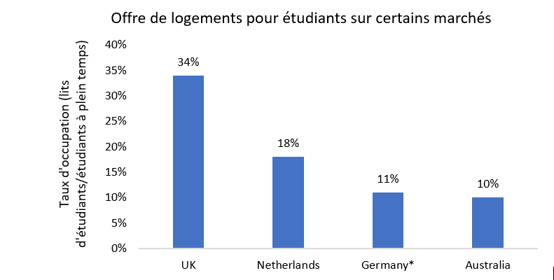 · Faible offre : Malgré l’augmentation du nombre d’étudiants et, par conséquent, des investissements, l’offre de logements étudiants reste largement insuffisante au niveau national. Les taux d’offre de logements étudiants (nombre de lits/étudiants à temps plein) sur les principaux marchés vont de 34% au Royaume-Uni à seulement 10% en Australie.